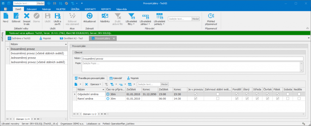 Nově je možné v systému TechIS u každého majetku definovat tzv. provozní plán. Jedná se o dobu, během které je majetek v provozu (např. jednosměnný nebo dvousměnný provoz). Tyto informace se následně používají při výpočtu metrik spolehlivosti a dostupnosti majetku.