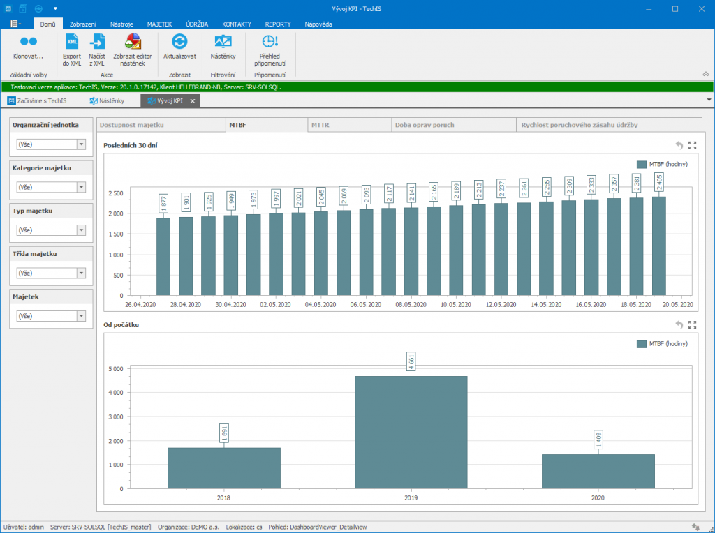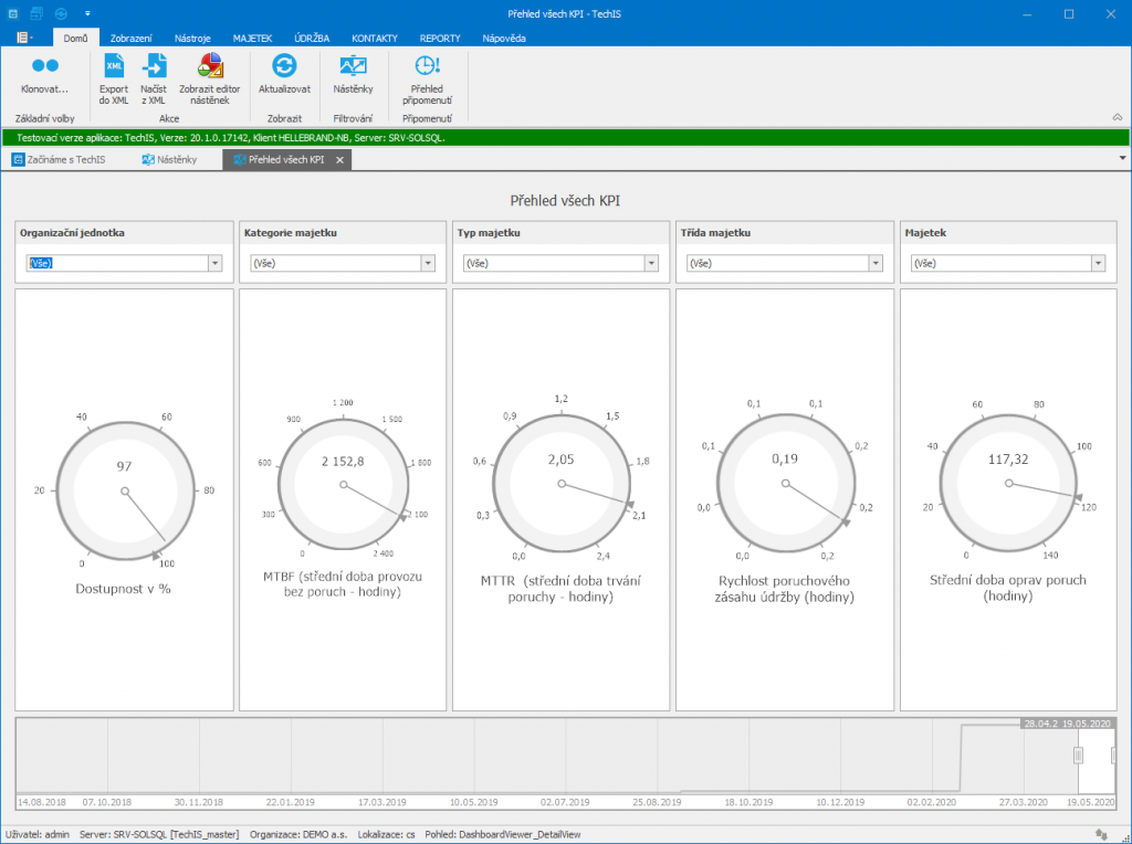 V systému TechIS ve verzi 19.2 byly poprvé představeny metriky spolehlivosti a dostupnosti majetku – tzv. KPI metriky (Key Performance Indicator). Jejich výpočet jsme ve verzi 19.4 značně vylepšili a propojili ho s provozním plánem majetku. Přidali jsme i nové nástěnky s grafickým zobrazením těchto metrik. Grafy jsou interaktivní, takže mohou snadno sloužit k analýze údajů o majetku.