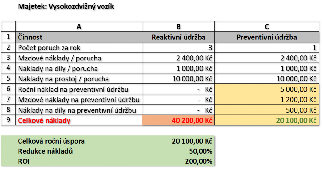 V našem teoretickém příkladu došlo zavedením procesu preventivní údržby u vysokozdvižného vozíku k redukci nákladů na údržbu o 50%. V absolutní hodnotě je to roční úspora 20 100,00 Kč.