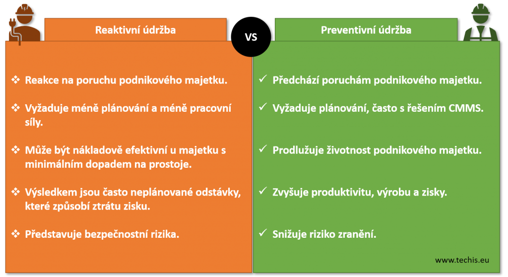 Pojďme se tedy podívat na rozdíl mezi procesem reaktivní (korektivní) a preventivní údržby. Rozdíl mezi reaktivní (korektivní) a preventivní údržbou vidíte na následujícím obrázku.